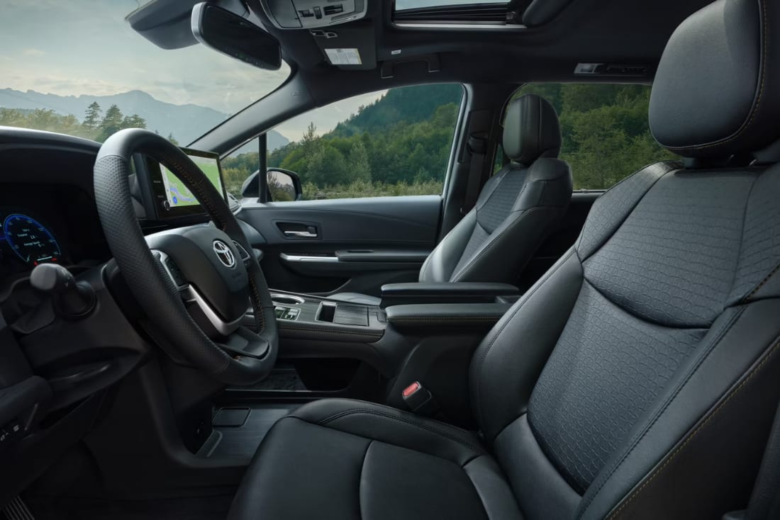 Inside the Toyota Sienna, you’ll find a thoughtfully designed cabin that combines premium materials with practical touches. The available leather-trimmed seats, ambient lighting, and panoramic moonroof create an upscale atmosphere, perfect for date nights or solo drives. For larger groups, the Sienna’s One-Motion-Stow third-row seats make it easy to switch between passenger space and extra cargo room.